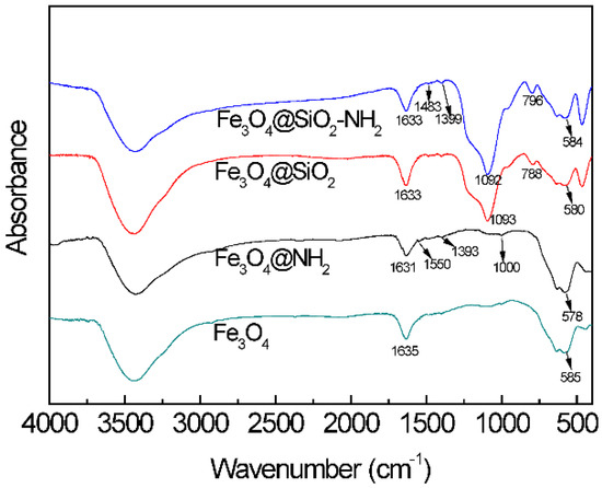 The MNPs samples were characterized by Fourier-Transform Infrared Spectroscopy (FT-IR), the results were shown in Figure 2. It can be seen that all the MNPs have the absorbance peaks around 3400 cm−1 and 1630 cm−1, which was contributed by the hydroxyl of water in the MNPs. All the MNPs have a stretching vibration peak around 580 nm for Fe-O bond. Fe3O4@NH2 and Fe3O4@SiO2-NH2 have stretching vibration peaks around 1092 for Si-O bond. Due to the amidogen in Fe3O4@NH2 and Fe3O4@SiO2 was interfered by the hydroxyl of water, it is hard to identify the amidogen in the MNPs. Thus, a further step for the quantitative determination of amidogen was performed by ninhydrin test [24]. The results showed that the amidogenin Fe3O4@NH2 and Fe3O4@SiO2-NH2 was 0.64 and 0.512 mg/g, respectively.