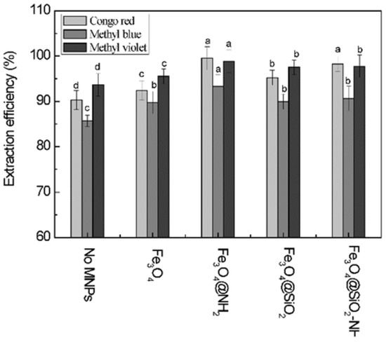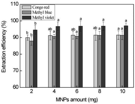 Effect of the Fe3O4@NH2 amount added to the AMTPS on the extraction efficiency of dyes. (Each system contained 10 mL dyes solution (1 mg/mL CR, MB and 0.125 mg/mL MV), 4 wt. % TX-114, 40 min vibration time, and incubated at temperature 40 °C for 10 min). Different letters in the same series indicate significant difference at p < 0.05 level.