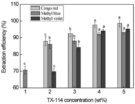 TX-114 was chosen in this study due to its ambient cloud point (23–25 °C) at different concentrations, low toxicological properties and cost, in addition the high density in surfactant rich phase facilitating phase separation by centrifugation, which was the most popular nonionic surfactant used in the CPE [25,26,27]. The effect of TX-114 concentration can be the major factor influencing the extraction. The TX-114 solution can form two phase above the cloud point temperature, a lower phase with high surfactantconcentration, and the other aqueous top phase with low surfactant concentration (slightly above the CMC of TX-114) [28]. Thus, the effect of TX-114 concentration in the range of 1–5 wt. % (weight ratio) was investigated. The phase-separation cannot be achieved at 1 wt. % TX-114 concentration during the extraction of CR and MV. It can be seen in Figure 5 that the extraction efficiencies obviously increased with increase of TX-114 concentration. Because the extraction mainly depended on the TX-114 and the influence of MNPs to extraction efficiency can be concealed at high TX-114 concentration, thus, the 4 wt. % TX-114 concentration was chosen for further studies.