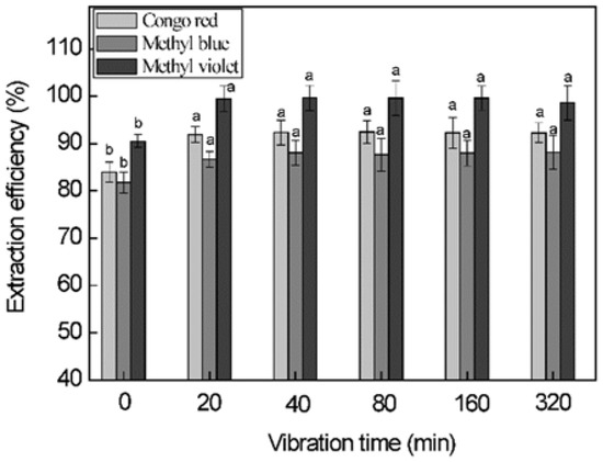 The extraction was performed in a shaking bath, the vibration time of 20–320 min was studied, and no vibration was used as the control. The role of the vibration is to make sufficient contact for the dyes with the surfactant and MNPs. The results in Figure 6 showed that the extraction of the threedyes was significantly affected by the vibration compared with the controls, but the extraction efficiencies varied little with the vibration time larger than 20 min. Thus, the vibration time of 20 min was enough for the extraction.