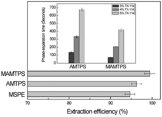 The MAMTPS was combined with the MSPE and AMTPS, thus, it has the advantages of both MSPE and AMTPS. The results of extraction efficiencies for MAMTPS, MSPE and AMTPS, and the phase-separation time for MAMTPS and AMTPS were shown in Figure 8. It can be seen that theMAMTPS had higher extraction efficiency than MSPE and AMTPS. Moreover, MAMTPS had short extraction time than MSPE, the extraction time was 20 min and phase equilibrium time was about 10 min for MAMTPS, which was much shorter than that of 4 h vibration timeforMSPE. The complete phase-separation time of MAMTPS was reduced by >37% compared with AMTPS at different TX-114 concentration. Similar results were reported that the addition of MNPs can shorten the phase separation time in other ATPSs [18,31].