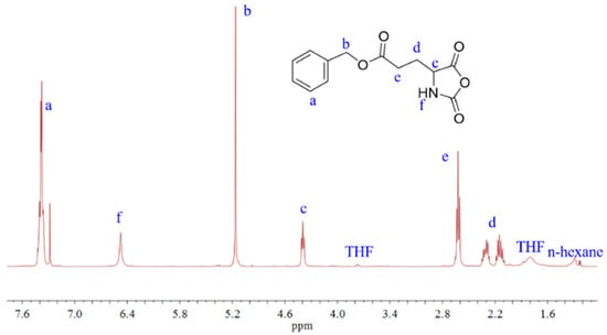 γ-Benzyl-l-glutamate-N-carboxyanhydride (BLG-NCA) was synthesized from BLG and triphosgene in dried THF according to the literature [26]. BLG-NCA was recrystallized from THF/hexane (v/v, 1/3) and dried at 50 °C in vacuum, as confirmed by 1H Nuclear Magnetic Resonance (NMR) spectroscopy (see Figure 1).
