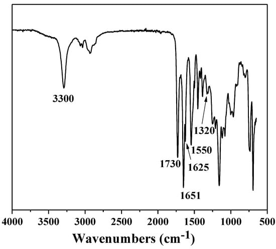 Figure 3 exhibits the FTIR spectrum of the resulting PBLG-PPG-PBLG. The amide I (backbone C=O stretch) region is present at 1600–1700 cm−1, which could be used to determine the structure (e.g., α-helix, β-sheet) of polypeptides [27]. The strong band of α-helix occurs at ~1668 cm−1 (left-handed) or ~1655 cm−1 (right-handed). The amide I peak is located at lower wavenumbers for a parallel β-sheet (1636–1640 cm−1) compared to an antiparallel β-sheet (1622–1632 cm−1) [27]. It can be clearly observed from Figure 3 that the obtained PBLG-PPG-PBLG not only forms right-handed α-helix, but also has antiparallel β-sheet structure, as reported for PBLG-b-poly(dimethylsiloxane)-b-PBLG [28]. The percent of β-sheet conformation was calculated to be ~5.12% by the deconvolution of the amide I region (1620–1670 cm−1). Moreover, the strong absorptions at 3300 and 1730 cm−1 are corresponding to the stretching vibration of N−H and C=O stretching vibration of benzyl ester group, respectively. The characteristic peaks at 1550 and 1320 cm−1 are assigned to amide II and III bands, respectively [29].