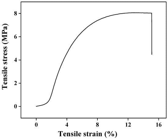 The thermal properties of the obtained PBLG-PPG-PBLG film were measured by DSC and TGA. Figure 4 shows the DSC curve of the PBLG-PPG-PBLG film during heating and cooling. Only one glass transition temperature (Tg) was clearly observed, corresponding to the PBLG units [30]. The Tg taken from the first heating curve was higher than one from the second heating curve (26 °C). Additionally, the sample shows an endothermic peak around Tm = 100 °C in the first heating process, which may be due to α-helical transition [30,31]. Figure 5 displays the TGA analysis of the PBLG-PPG-PBLG film. The sample began to decompose at above 280 °C, as evidenced by the rapid decrease in weight, indicating good thermal stability. Mechanical property of the resulting PBLG-PPG-PBLG film was examined by tensile test. Figure 6 exhibits the stress-strain curve, and its tensile strength, elongation and Young’s modulus are 8.0 MPa, 13.1%, and 208 MPa, respectively.