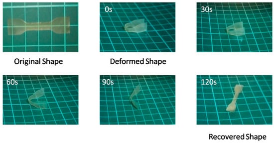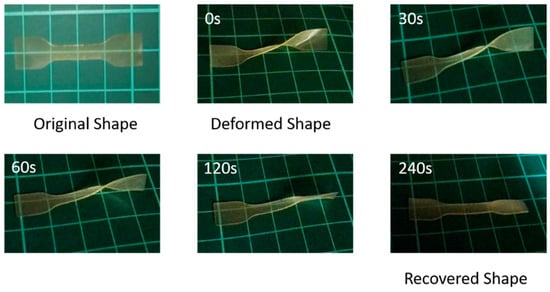 The shape memory properties of the obtained PBLG-PPG-PBLG film were quantitatively evaluated by the bending test. The straight specimen was bent into a “U”-like shape at 100 °C, then cooled down to room temperature with an external force to maintain the deformation. After that, the recovery process was recorded with time at 100 °C, as shown in Figure 7 and Figure 8. The shape fixity ratio (Rf) was close to 100%, and the shape recovery ratio (Rr) inceased with time, which reached ~100% after only 120 s. Furthermore, recovery process of the spiral deformed sample at 100 °C was also investigated, as shown in Figure 9. A full recovery was observed after 240 s. The high Rf and Rr may be due to the existing β-sheet structures as netpoints [16]. The synthesized PBLG-PPG-PBLG exhibits good shape memory behavior, which are promisingly applied in many biomedical applications.