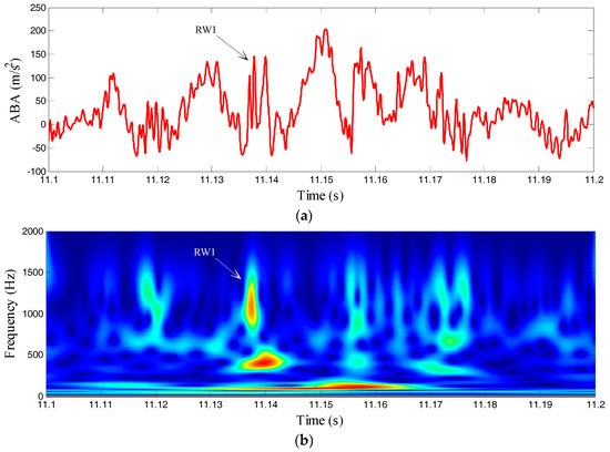 The response of ABA in (a) time and (b) time–frequency domain when a vehicle passes the rail welds at a speed of 300 km/h on a certain high-speed line.