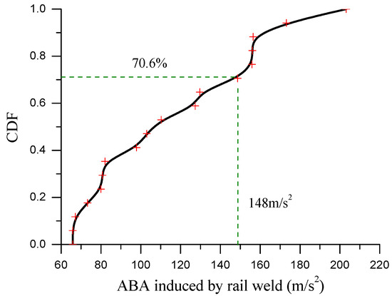 As shown in Figure 4, the signal contains 17 groups of acceleration responses of the axle box at rail welds. CDF (cumulative distribution function) has been used to create statistics on the amplitude of axle box acceleration at these rail welds, as shown in Figure 6. It is obvious that the 17 groups of axle box accelerations change between 66 and 200 m/s2 with nearly 70.6% of the ABAs less than 148 m/s2.