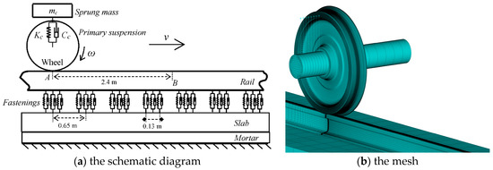 Figure 7 shows a 3D high-speed wheel/rail rolling contact finite element (FE) model and simulates a vehicle–track system on the high-speed railway line. Only half of a wheelset and track are simulated since the relative longitudinal and vertical planes of a vehicle–track system are symmetric. All components above the primary suspension of a vehicle are simplified as mass points and connected with wheels through the primary suspension. The high-frequency feature between the wheelset and track was fully considered through 3D modeling. It can be approximately assumed that the acceleration of the outer end of the wheel axle is consistent with that of the axle box. The track is a non-ballast track, which was modeled with consideration of the rails, fasteners, slab, and cement asphalt (CA) mortar. The fastening system contains support stiffness and damping that are relevant to the dynamic behavior. The track length of 15.6 m was considered in the model to eliminate the influence of boundary conditions.