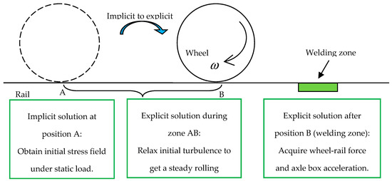 The explicit integral has been widely applied in the solution of the high-frequency phenomenon due to its small time step (the integration time step for the model in this paper was s). Implicit–explicit analysis was adopted in the simulation in order to smooth the dynamic interaction of the wheel and rail by reducing the excitation of the initial energy in the rolling process. Figure 9 shows a schematic diagram of the simulation process; positions A and B are the same as that of Figure 7a. It firstly adopts an implicit algorithm to solve the static contact in the initial position of the wheel, and then it initializes the explicit rolling contact calculation with the vehicle rolling forwards at a constant angular and forward speed v and driven by a constant traction coefficient . The traction coefficient defined by Equation (5) is 0.15 for a typical traction scenario and the friction coefficient is 0.5 for a typical dry wheel–rail contact situation. Note that no force is applied in the lateral direction.