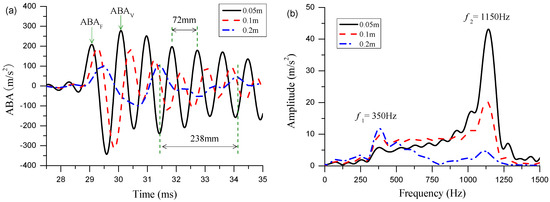 Time-course changes of ABA excited by rail welds with different wavelengths on a high-speed railway line (300 km/h) are presented in Figure 10a. The data has been processed by a 1500 Hz LPF and conforms to the measured data shown in Figure 4. Considering the typical size of the measured weld geometry [5] and the features of short wavelengths concerned in the paper, the wave depth was assumed as 0.2 mm and three wavelengths including 0.05 m, 0.1 m, and 0.2 m were selected. Taking as an example the working condition at a wavelength of 0.05 m, the acceleration of the axle box fluctuated within ±20 m/s2 as a result of elastic deformation between the wheel and rail. This value is less than the measured data (±50 m/s2, see Figure 4) due to the geometry irregularities of the actual line not being considered. When passing the rail weld, it excites strong vibrations of ABA. The first wave crest ABAF was reached at 204.6 m/s2 and was caused by the impact of the rail weld. The continuous fluctuation depends on coupled vibration of the vehicle–track system with a vibration wavelength of 72 mm. It can be observed that ABAV is significantly higher than the first wave crest excited by the rail weld. The phenomena can be found in the measured data of RW1 in Figure 5a.