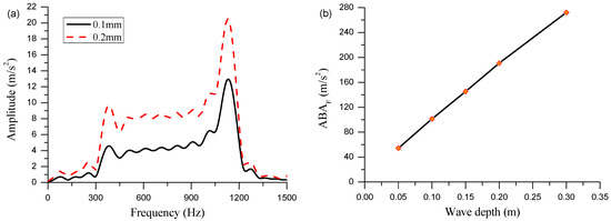 Wave depth is another important parameter of rail weld irregularities, and was also calculated here to know its influence on ABA; a typical wavelength was considered as 0.1 m. The frequency-domain responses of ABA under wave depths of 0.1 and 0.2 mm are presented in Figure 12a. It can be seen that the wave depth affects only the amplitude of ABA but with identical frequency under different wave depths. Thereby, ABAF in Figure 12b grows almost linearly when the wave depth increased from 54.3 m/s2 to 272.1 m/s2.