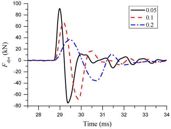 Time-course changes of variation of dynamic wheel/rail force Fdyn (the difference between the wheel/rail force and the static wheel load) of the three rail welds in Figure 10a are presented in Figure 13. When the wheel passed over the rail welds, Fdyn initially increased to a peak and then decayed gradually to complete the impact; the amplitude of Fdyn fluctuation was small once leaving the rail weld. By comparing to Figure 10a, it is easy to discover that the rail weld can excite only one impact of the wheel/rail force, but it can induce continuous fluctuations of ABA. The phenomena can be explained by the wheel/rail force that is determined mainly by local geometry irregularity. Thus, no obvious impact action will appear upon passing through the weld. Moreover, continuous fluctuations arise since ABA belongs to the structural vibration with energy that is difficult to dissipate quickly by primary suspension. The maximum of Fdyn will decrease in turn along with the wavelength increase, consistent with the change trend of ABAF.