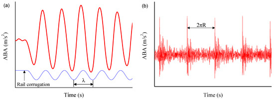 Schematic diagrams of axle box acceleration induced by (a) rail corrugation and (b) wheel flat.