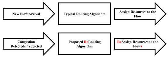 Outline of the proposed schemes. The proposed scheme can work with any of existing routing algorithm. In this architecture, a typical routing algorithm routes one flow in each step while the proposed rerouting algorithm reroutes several flows to reduce the packet loss and provides a better QoS (quality of service) to the users.