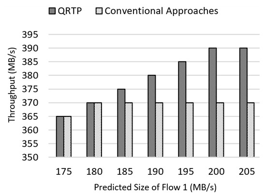 Considering flow 1 = 100 MB/s, flow 2 = 110 MB/s, and flow 3 = 90 MB/s, the network throughput in both approaches is the same. Increasing the size of flow 1 to 110 MB/s does not have a negative impact on the approaches, since, in both approaches, the resources are assigned to the flows in a way that they can tolerate this amount of traffic rate increment. However, when the size of flow 1 increases more than 110 MB/s, in the configuration which is done by the conventional approaches, the link between S1 to S3 becomes a hot-spot and could not handle this much traffic load. On the other hand, the proposed scheme can handle up to 200 MB/s flow rate increment. Therefore, the throughput increases up to 400 MB/s in our scheme, while it cannot exceed 310 MB/s in conventional approaches.