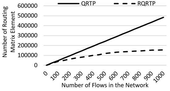 Comparison of QRTP (QoS-aware resource reallocation traffic prediction) and relaxed QRTP (RQRTP) based on the number of routing matrix element. Increasing the number of active flows in the network makes the superiority of RQRTP more clear. This happens because RQRTP exploits flow aggregation technique to reduce the number of routing matrix elements.