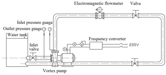 The pump is directly connected to the motor, and the power of the pump shaft was measured by the electronic method. The no-load motor is in line with GB/T 12785-91 standards (Test Methods for Submersible Motor Pumps), the pump performance test was carried out according to GB/T 3216-2005 (Rotodynamic Pumps—Hydraulic Performance Acceptance Tests, Grades 1 and 2), and the frequency converter was used to adjust to the rated speed.