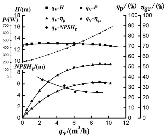 ηp: pump efficiency; ηgr: unit efficiency; H: pump head in m; P: shaft power in W; NPSHc: critical net positive suction head in m; qv: discharge in m3/h; qv-H: discharge-pump head; qv-P: discharge-pump shaft power in w; qv-ηp: discharge-pump efficiency; qv-ηgr: discharge–unit efficiency; qv-NPSHc: discharge-critical net positive suction head.