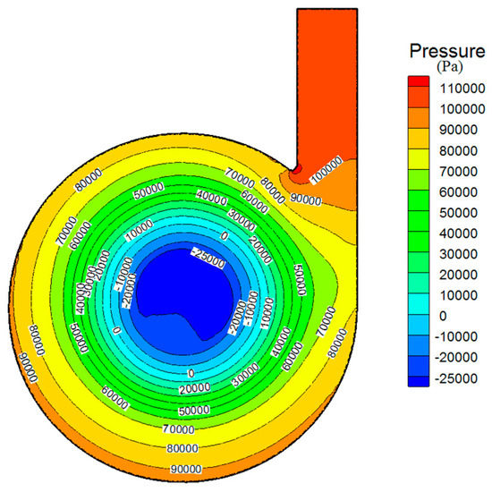 The stable pressure gradient is formed from the inlet of the vortex pump to the center of the impeller. The lowest pressure in the vortex chamber is −2.5 × 104 Pa and it is located at the center of the cavity of vortex chamber. The area of low pressure is greater than the pump entrance area. Therefore, the 32WB8-12 vortex pump has advanced suction and anti-cavitation performance.