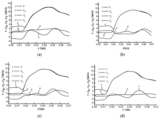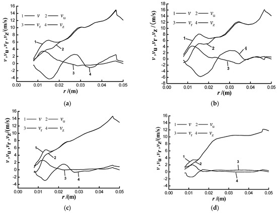 In the range of r > 20 mm, the center speed of vu and the absolute speed of the impeller almost coincide with each other, and have greater values than the speed at the center of the vortex chamber. That is, the velocity of the volute chamber lags behind the rotation velocity of the impeller, and the vortex chamber and almost coincide. It can be seen that the width of the volute chamber should not be designed too wide under the premise of ensuring passing capacity; otherwise, the delay of the chamber velocity will increase.