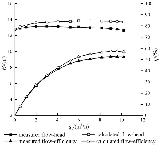 The discharge calculation software CFX was used to calculate the discharge at 2850 r/min. The calculated performance and measured curves are shown in
