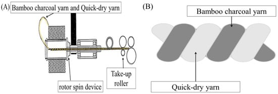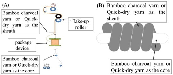 In order to examine the influences of wrapping and twisting processes on the properties of the functional elastic knits, bamboo charcoal yarns and quick-dry yarns were twisted into twisted yarns using a rotor machine, while the other batch was wrapped into wrapped yarns using a hollow spindle spinning machine. During the process, the twist number was obtained based on the rotating speed difference between the winding and take-up processes. Table 1, Table 2 and Table 3 show the compositions, parameters, and specifications of wrapped/twisted functional composite yarns. Figure 1 shows the diagrams of a rotor spindle machine and twisted yarn. The bamboo charcoal yarn and the quick-dry yarn were intertwined evenly to form a spiral structure (Figure 1B) using a rotor spin device. Figure 2 shows the assembly of a hollow spindle machine and the structure of a wrapped yarn. A bamboo charcoal yarn and quick-dry yarn were wrapped in two manners, where the bamboo charcoal yarn was the core and the quick-dry yarn was the sheath, and otherwise.