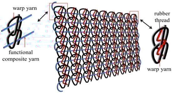 Functional elastic knits where the black yarn is the warp yarn, the red yarn is the rubber thread, and the blue yarn is the functional composite yarns.