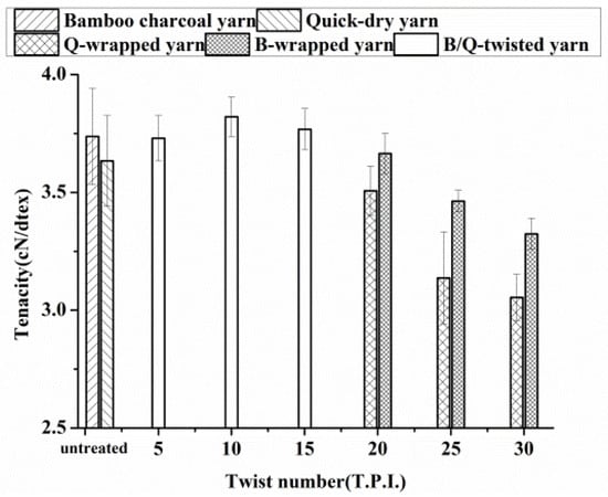 Tenacity of functional composite yarns in relation to the administration of a wrapping/twisting process as well as the twist number. The error bar indicates the Standard deviation (SD). Q: Quick-dry, and B: Bamboo charcoal.