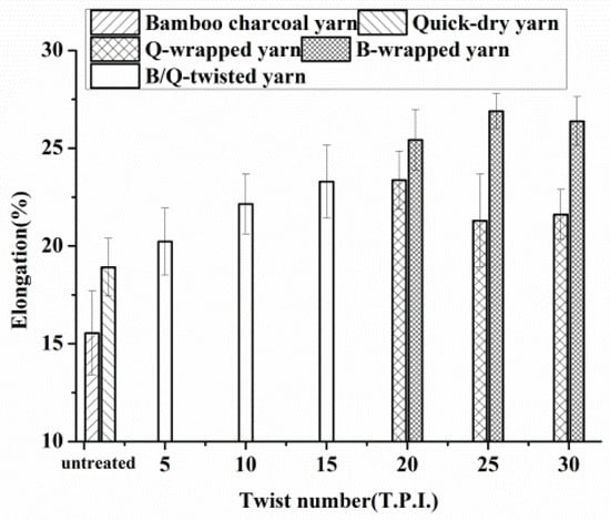 Figure 4 shows that the twisting process provides functional composite yarns with greater tenacity, as compared to the tenacity of the control group (i.e., pure bamboo charcoal yarns and quick-dry yarns). Conversely, the wrapping process provided functional composite yarns with greater tenacity, as compared to the tenacity of the control group. Bamboo charcoal yarns had a low tenacity and elongation at the break, according to Table 3 and Figure 5. The wrapping and twisting process improved the extensibility of the yarns. Therefore, regardless of whether it was wrapped yarns or twisted yarns, the elongation at the break of the functional composite yarns was proportional to the twist number of the yarns.
