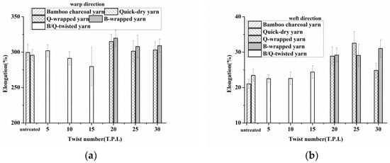 Elongation along (a) the warp direction and (b) weft direction of functional elastic knits in relation to the administration of a wrapping/twisting process as well as the twist number of the yarns. The error bar indicates the SD.