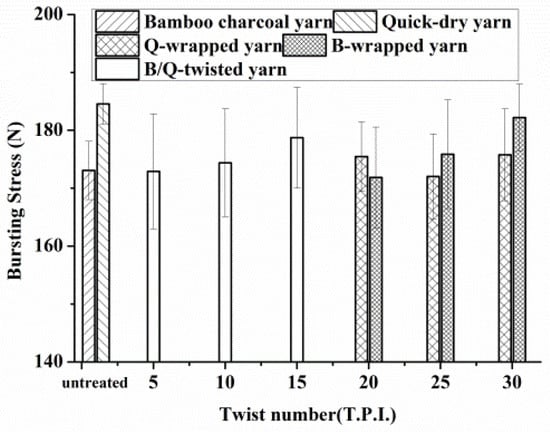 Bursting stress of elastic knits as related to parameters of different functional yarns. The error bar indicates the SD.