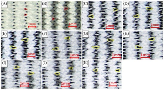 Surficial observation of the functional elastic knits that are made of (A) quick-dry yarn; (B) bamboo charcoal yarn; (C) 20 T.P.I. B-wrapped yarn; (D) 25 T.P.I. B-wrapped yarn; (E) 30 T.P.I. B-wrapped yarn; (F) 20 T.P.I. Q-wrapped yarn; (G) 25 T.P.I. Q-wrapped yarn; (H) 30 T.P.I. Q-wrapped yarn; (I) 5 T.P.I. B/Q-twisted yarn; (J) 10 T.P.I. B/Q-twisted yarn; and (K) 15 T.P.I. B/Q-twisted yarn. The small pore size is indicated in red drop-like triangles and the large pore size is indicated yellow drop-like triangles.