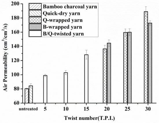 Air permeability of functional elastic knits in relation to the administration of a wrapping/twisting process as well as the twist number of the yarns. The error bar indicates the SD.