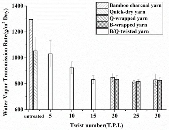 Water vapor transmission rate of functional elastic knits in relation to the administration of a wrapping/twisting process as well as the twist number of the yarns. The error bar indicates the SD.