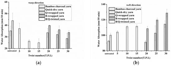 Water absorption along (a) the warp direction and (b) weft direction of functional elastic knits in relation to the administration of a wrapping/twisting process as well as twist number of the yarns. The error bar indicates the SD.