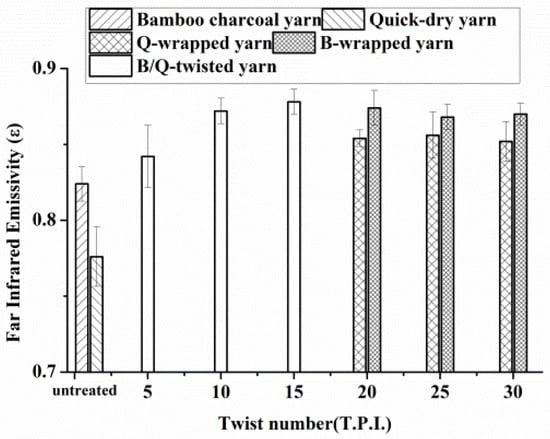 This result was due to the fact that the wrapping or twisting process increased the content of the bamboo charcoal yarn in the functional composite knits, thereby improving the FIR emissivity. The Q-wrapped yarns were composed of a smaller amount of bamboo charcoal yarn, and the wrapping process further decreased their diameter, debilitating the radiation of FIR rays. Moreover, a previous study indicated that increasing the numbers of lamination layers increased the contact area with FIR radiation, and thus, improved the FIR emissivity [33].