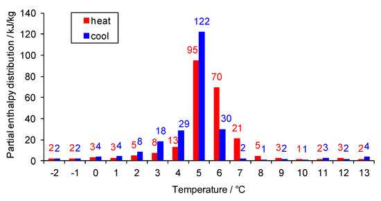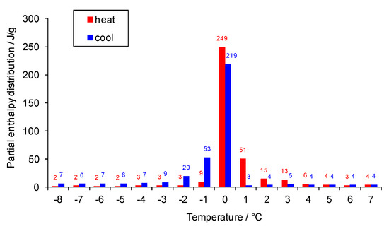 Water and an alkane mixture named OP5E manufactured by Ruhr New Material Technology Co., Ltd. in Hangzhou in China have been used as PCM in this paper. Their phase change temperature and enthalpy were analyzed with a three-layer calorimeter. Figure 2 and Figure 3 present the stored heat of water and of OP5E as a function of temperature in the case of heating/cooling respectively. The bars in the figures display the partial enthalpy of the material in a temperature interval of 1 K. The temperature, at which the maximal partial enthalpy appears, corresponds to the melting/freezing point of the material. From Figure 2 it can be seen that water has a melting/freezing peak at 0 °C and the total enthalpy is 340 kJ/kg between −2 °C and 4 °C, while OP5E has a melting/freezing temperature at 5~6 °C, and the total enthalpy is 235 kJ/kg between 2 °C and 8 °C (see Figure 3). Their technical parameters and the total mass used in the container are given in Table 1. The enthalpy and the total mass of water and OP5E were used for the heat transfer calculation in Section 2.2.