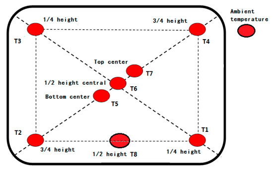 A temperature-controlled chamber was used to simulate the above-mentioned temperature conditions. Eight temperature sensors were put inside the container and one for the ambient, as shown in Figure 5. The time period, in which one of the measuring points firstly reaches the maximum or minimum temperature allowed, was taken as the temperature-controlled time of the container. All of the tests were repeated three to five times, and the typical results were presented in this paper.