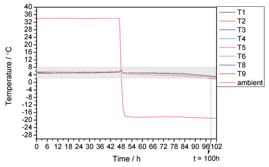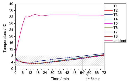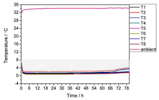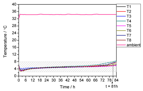 Figure 6, Figure 7 and Figure 8 present the ambient temperature and air temperature inside the container without PCM, with water as PCM and with OP5E as PCM under extremely high temperature condition, respectively. It can be seen that the temperature-controlled time was less than 1 h (about 54 min) by using the container without PCM. The performance was distinctly improved when incorporating a PCM into the container. However, the most measuring points inside the container showed a temperature at 1~2 °C for the first 70 h by applying water as PCM. This would cause a subcooling of drugs or food during the transportation. On the other hand, the air temperature inside the container was controlled in the range of 2~8 °C for 81 h by using OP5E as PCM. It kept at 4~5 °C for most of the time, which corresponds to the melting/freezing peak temperature of OP5E. In all three cases, the measuring point, which firstly exceeded the maximum temperature of 8 °C, was one of the points in the corner of the container, namely T1, T2, T3, or T4. The reason was that the tightness between the insulator base and lid is normally worse in the corner than elsewhere. Consequently, the heat transfer was intensified in the corner by the air leakage. Furthermore, it was observed that the air temperature in the container decreased firstly and then went up. The reason was that the container was not pre-cooled before the test because of the limited operation condition. The air in the container had the room temperature at the beginning and was firstly cooled when inserting the frozen PCM panels into the container. The air temperature began to rise when heat was transferred from the ambient to the inside of the container.