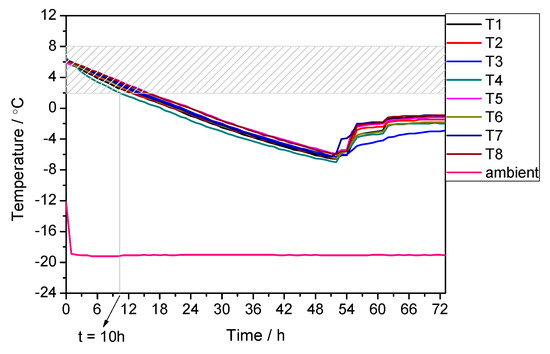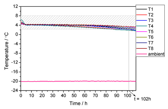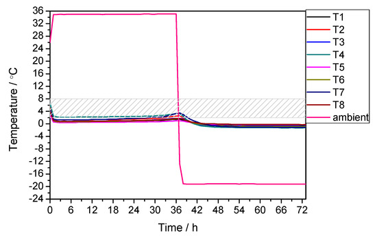 The above-mentioned studies focus on the trucks or containers having a refrigeration system. However, insulated containers integrated with PCMs are also an attractive alternative for cold-chain systems. Such containers do not use any conventional refrigerators, but a thermal energy storage of PCMs to control the internal temperature. The PCMs are normally preconditioned when stationary and provide cooling or heating when in service. The temperature-controlled time is mostly within 48 h due to the limited thermal capacity of PCMs and the poor insulation of the containers. For example, the company EMBALL’ISO in Saint-Georges-de-Reneins in France provides a packaging comprising a cardboard box, six vacuum insulation panels, and six PCM briquettes [7]. This packaging is normally used for an isothermal transportation up to 48 h at extreme temperatures.