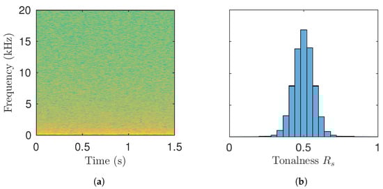 (a) Spectrogram of pink noise and (b) the histogram of tonalness values for its spectrogram bins.