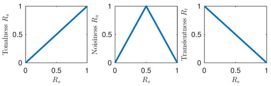 The tonalness, noisiness, and transientness can be used to denote the degree of membership of each STFT bin to the corresponding class in a fuzzy manner. The relations between the classes are visualized in Figure 3.