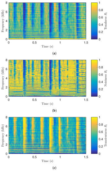 Figure 4 shows the computed tonalness, noisiness, and transientness values for the STFT bins of the example audio signal used above. The tonalness values in Figure 4a are close to 1 for the bins which represent the harmonics of the piano and double bass tones, whereas the tonalness values are close to 0 for the bins which represent percussive sounds. In Figure 4b, the noisiness values are close to 1 for the bins which do not significantly contribute either to the tonal nor the transient components in the input audio. Finally, it can be seen that the transientness values in Figure 4c are complementary to the tonalness values of Figure 4a.