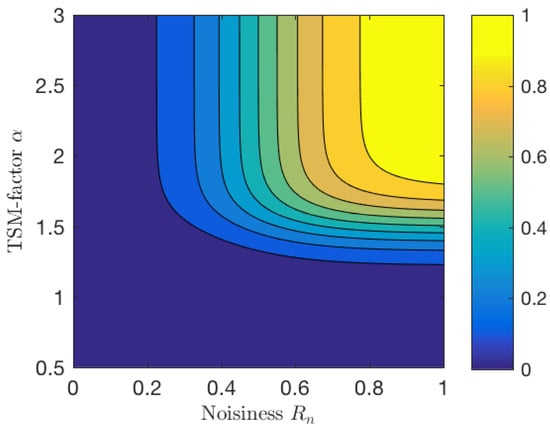 The phase randomization factor , as a function of the estimated noisiness and the TSM factor , is shown in Figure 5. The phase randomization factor increases with increasing TSM factor and noisiness. The phase randomization factor saturates as the values increase, so that at most, the uniform noise added to the phases obtains values in the interval .