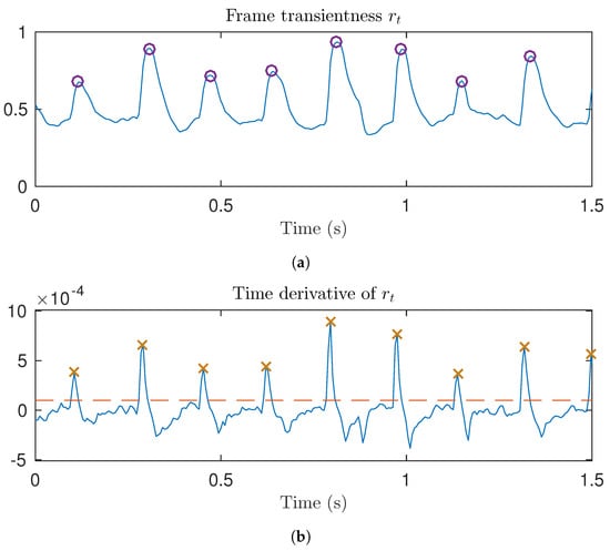 Illustration of the proposed transient detection. (a) Frame transientness. Locations of the detected transients are marked with purple circles; (b) Time derivative of the frame transientness. Detected transient onsets are marked with orange crosses. The red dashed line shows the transient detection threshold.