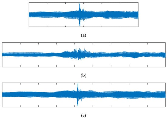 An example of the proposed transient preservation method. (a) shows the original audio, consisting of a solo violin overlaid with a castanet click. Also shown are the modified samples with TSM factor , using (b) the standard phase vocoder, and (c) the proposed method.