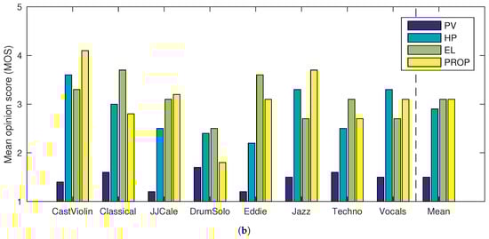 Mean opinion scores for eight audio samples using four TSM methods for (a) medium (), and (b) large () TSM factors. The rightmost bars show the average score for all eight samples. PV: phase vocoder; HP: harmonic–percussive separation [28]; EL: élastique [36]; PROP: proposed method.