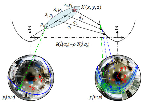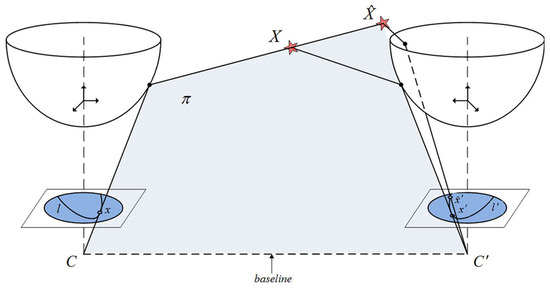 This adaption to the omnidirectional geometry is represented in Figure 2. The projection of the point X on two image references, x and , is determined by the epipolar plane, , and both camera centers C and . An essential aspect is related to l and , as the epipolar lines that determine the geometric location where feature points should be matched. This is a key aspect for us in order to implement an advanced visual matching, which ultimately returns potential data for a robust localization.