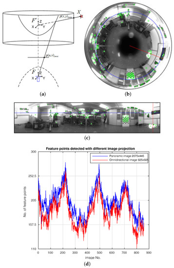 Projection conversion from omnidirectional to panoramic view. (a) Conversion over the rays’ model side; (b) omnidirectional image with angular and radius variables indicated (,r); (c) same image in its panoramic projection, transferred to (u,v) coordinates; (d) comparison of the number of feature points found on omnidirectional and panoramic images, respectively.