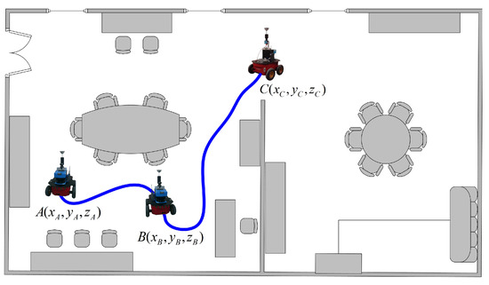 Navigation example along three different poses within an office-like scenario. The robot sequentially traverses poses A, B and C, respectively. Omnidirectional images are acquired at each pose, and feature matching and Bayesian regression are computed as per Equations (10)–(13). Motion transformations at both the pose reference and image reference are depicted in Figure 7a,b.
